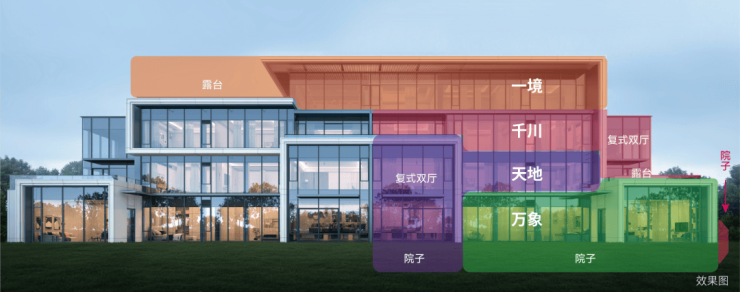 项目分为51%的可售建筑,49%自持建筑。整体设计利用天然的地理环境优势,使建筑最大化融入环境,减少对环境的破坏。将办公建筑形成不同组团,再结合景观、公共空间、过渡立面材料等手法将建筑联系成为整体。建筑、景观空间灵动、动静分明、组台有序充分满足创业人员的个性需求和高端品质。