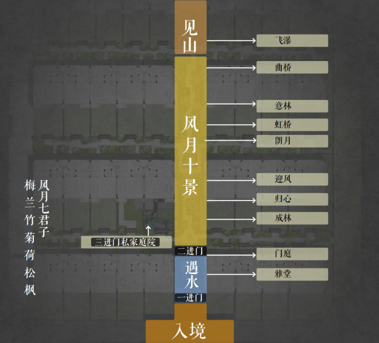 将传统中式建筑的礼序空间融入到创新的规划布局中,引山水入园,回归传统“街、巷、院、府”的空间体系,弱化路径感,形成由街入坊-置坊入巷-穿巷入院的归家礼序。