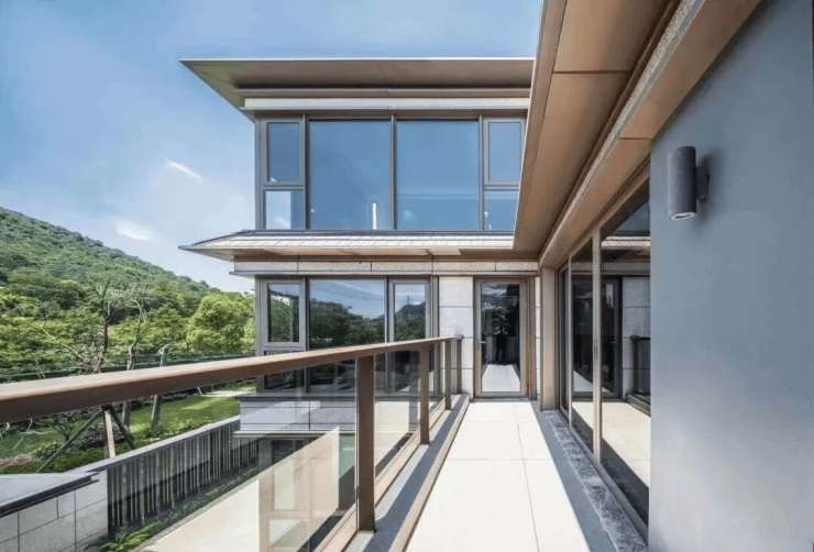 项目以经典三段式为设计基础,底部石材干挂,沉稳大气;全景门窗、及大面积玻璃栏板搭配质感材质,轻盈通透;顶部为单檐歇山顶,搭配批檐,融入最新设计语言,整体灰墙黛瓦,传承中式精髓又做到古法新制,贴合当下。在这山水与都市交汇之处,打造一处可以对话山水的当代桃源。