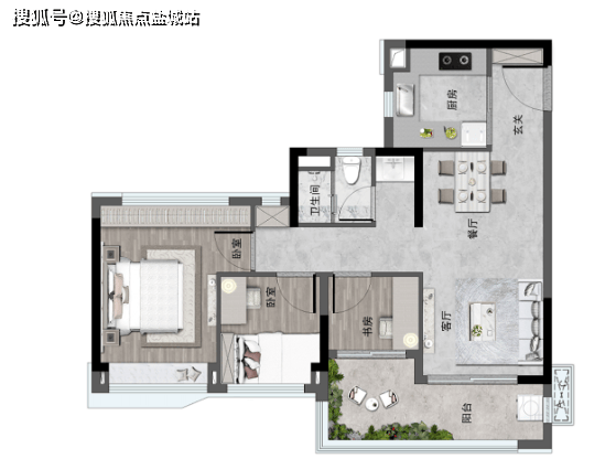 88㎡三房两卫也是四开间朝南,比75方多了个洗手间,另外也是超宽“L”型大阳台,约等于3+1房。比75方强的是收纳空间要强很多,入户门后做满墙柜,可以放一个房间的杂物。