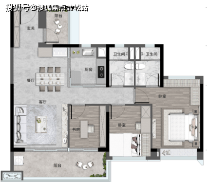 105㎡四房两卫也是4开间朝南,入户有个小阳台,大概5平米,可以改书房。有6米超宽阳台,可以看山景。主卧和次卧可以打通,未来可以做改动。