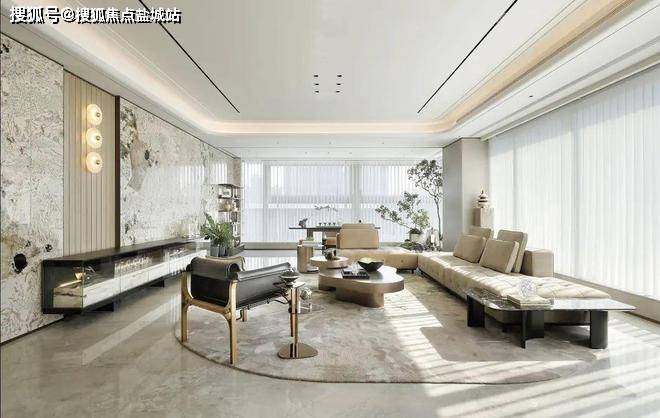 而李嘉诚御用设计师梁景华的390m²正厅,电视背景墙是意大利潘多拉奢石,甚至延伸到了空中花园,像是飞舞在皑皑雪山中的霓虹霞衣,在皓白的雪花上勾勒出写意的纹理,灿若繁星。
