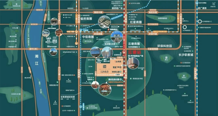 项目位于万家丽路与新韶山南路交汇处,北部为一本大学长沙理工大学云塘校区,南面为高云生态公园。距离地铁7号线云塘站(在建中)约150米,将南延至湘潭北站,预计2027年通车。步行5分钟内即可到达胖东来(2025年5月进驻)、红星美凯龙、创世纪三大商超及高云邻里中心(生鲜菜市场),周边友阿奥特莱斯+天虹-步步高商圈环伺,国家医学中心(湘雅新院区)相近不相邻,高端医疗为家人健康护航。