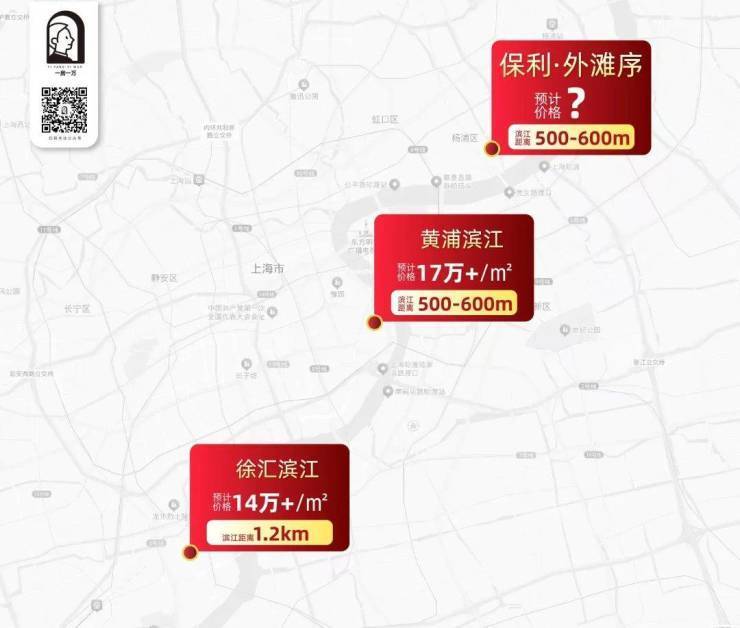 目前同样距离滨江约500m距离的黄浦滨江,新房价格站上了17万+;而在徐汇,距离黄浦江约1.2km的徐滨板块,单价也突破了14万+。