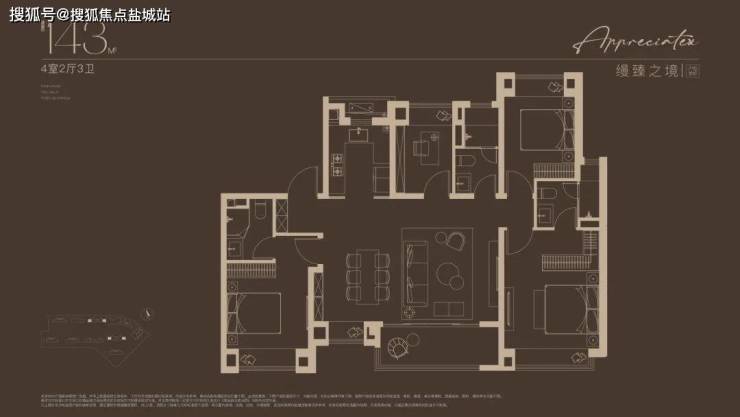建面约143㎡四房设计,不论是三代同堂还是二娃家庭,都舒居无忧!2梯2户的设计, 极具私密性的入户门厅,彰显大宅归家礼序 。独立玄关,既是归家仪式感,更添收纳空间;约14米朝南面宽,搭配约7米尺度横厅,尽显大宅风范; 东西双套房设计,奢享全龄世家的静谧时光。