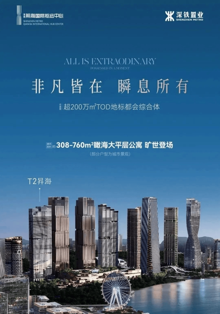 深铁前海国际枢纽中心首发T2 昇海,建面约308-760㎡瞰海大平层公寓,外立面取意风生水起之形,昂扬非凡人生格调,以全套房空间设计、IMAX环幕海景(部分户型为城市景观)、奢感公区配套,映照塔尖人物的生活尊崇。