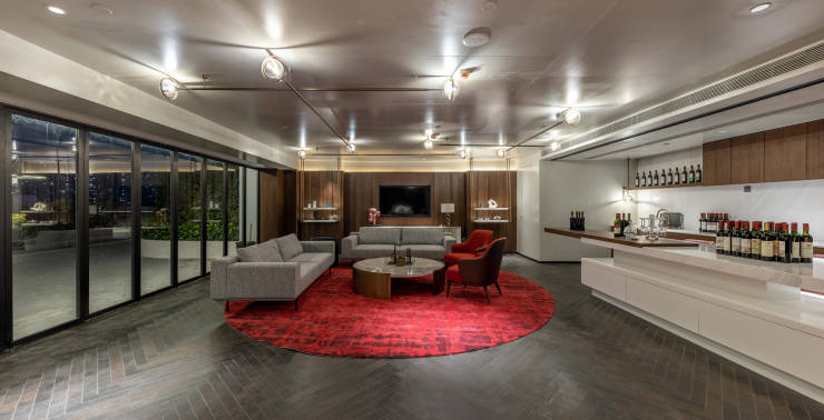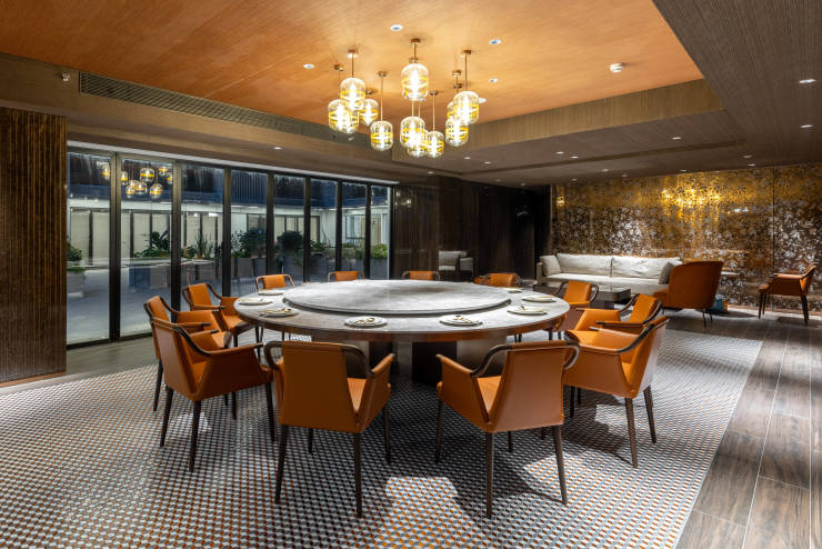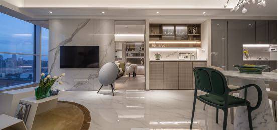 汤臣一品设计师——陈建中担纲设计,采用奢石、艺术马赛克、抽象派画作等元素设计手法搭配高奢撞色艺术家具,营造艺术社交空间。