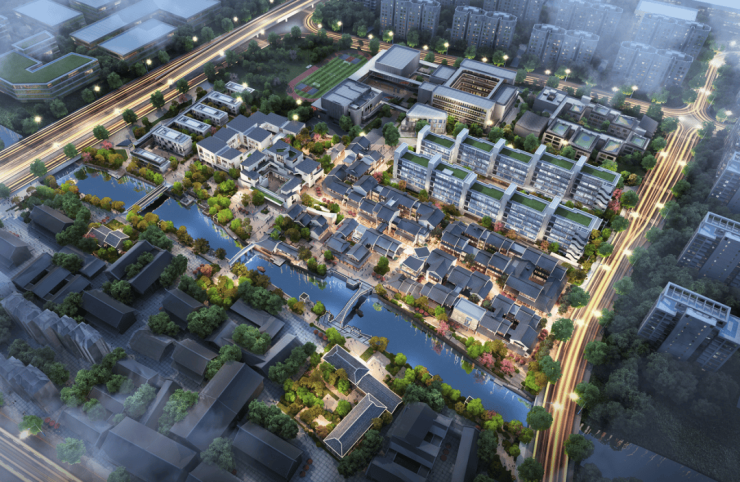 项目北侧五里塘河沿河中式街区、景观步道