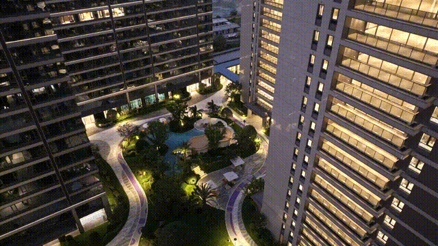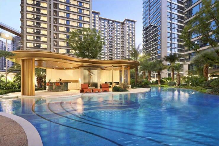 外立面主色调是豪宅最爱用的高级灰,铝板、干挂石材、金属线条构件搭配大面积玻璃。在日光下,立面的颜色会折射出不同的光影效果,质感非常高级。