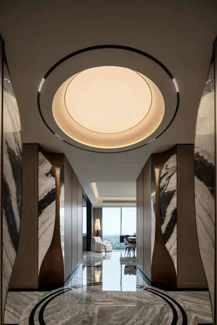 约300㎡“观湖”,谢柯打造;另一款是更宽舒的约412㎡“行云”,出自邱德光。尤其是约412㎡“行云”,无论玄关处雪花白、劳伦黑金、金世纪的大胆拼花,瓦楞式的波浪形电视背景墙,还是吸睛的普拉达绿石材吧台,全屋随处可见出色审美和奢华材质的完美结合。