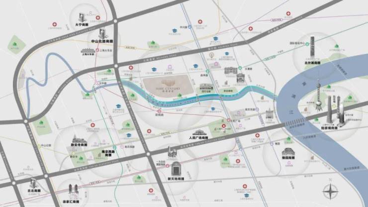 生态资源:项目一公里内有静安最大苏河湾中央公园,同时紧邻南北两块绿地公园,而南侧便是苏州河世界级滨水景观带,滨水而居。
