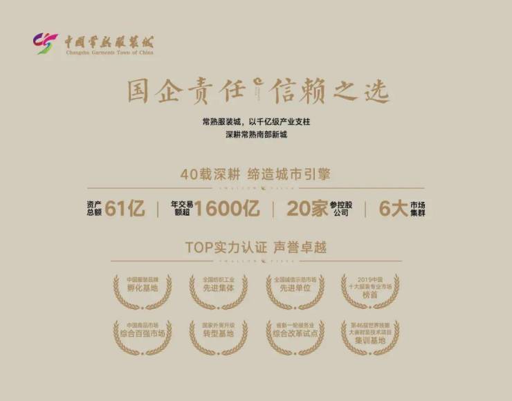 常熟服装城,以千亿级产业支柱,深耕常熟南部新城。旗下拥有六大专业市场,20家参控股公司,涉足地产、传媒、物流等,资产总额61亿,年交易额超1600亿元,是目前全中国最大的服装类专业市场之一。