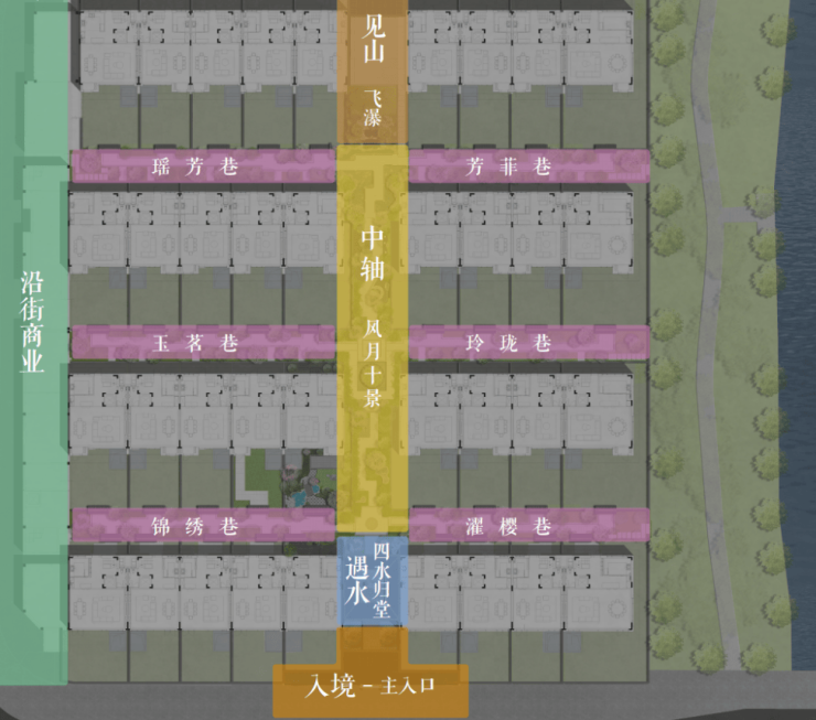 将传统中式建筑的礼序空间融入到创新的规划布局中,引山水入园,回归传统“街、巷、院、府”的空间体系,弱化路径感,形成由街入坊-置坊入巷-穿巷入院的归家礼序。