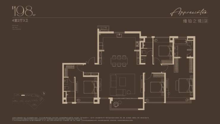 建面约143-198㎡四房三卫户型,2梯2户独立玄关设计,南向轩阔开间尺度(143户型约14米南向四开间,搭配约7米横厅;172户型约16米南向四开间,搭配约6米横厅;198户型约19米南向四开间,南北通厅设计,十字中轴洄游动线),揽四时风景入怀,东西双套房设计,奢阔尺度尽显家族气度,为高端改善和一步到位置业的优质选择。