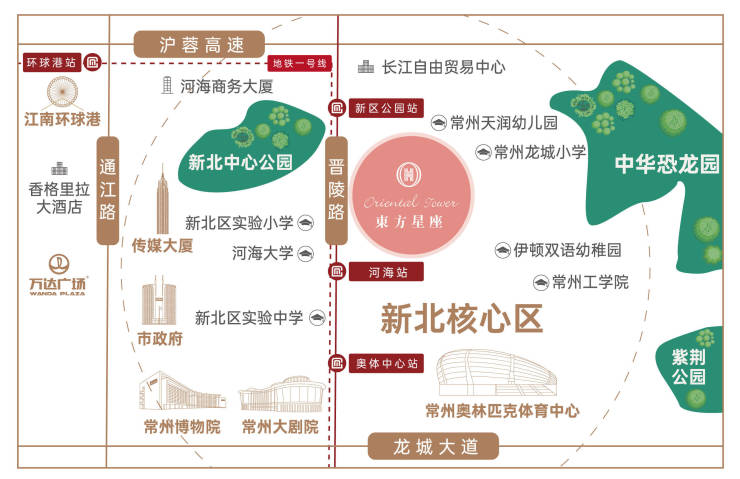 项目位于市府行政中心圈、生态旅游文化圈、商业娱乐休闲圈、精英贵族居住圈、医疗康养生活圈,五圈合一的核心地段,更是地铁1号线最宜居的一站——河海站上盖,纯正浪漫的法式建筑,是常州的名片级产品