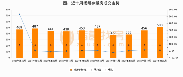存量房方面,第50周扬州存量房成交508套,较上周增加52套,环比上涨11.4%。从近十周成交走势来看,周均成交套数为450套,本周高于平均水平12.9%。