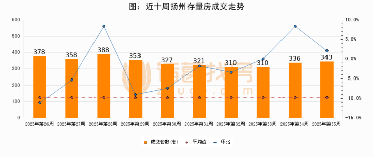存量房方面,第35周扬州存量房成交343套,较上周增加7套,环比上涨2.1%。从近十周成交走势来看,周均成交套数为342套,本周高于平均水平0.3%。