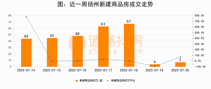根据扬州市住房和城乡建设局数据显示,2025年07月20日扬州新建商品房成交7套,较昨日增加3套,环比上涨75%。近一周扬州新建商品房日均成交40套。07月20日单日成交7套,低于近一周平均水平82.5%。