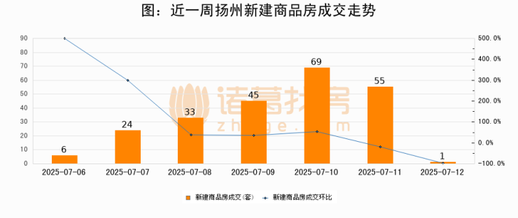 根据扬州市住房和城乡建设局数据显示,2025年07月12日扬州新建商品房成交1套,较昨日减少54套,环比下降98.2%。近一周扬州新建商品房日均成交34套。07月12日单日成交1套,低于近一周平均水平97.1%。