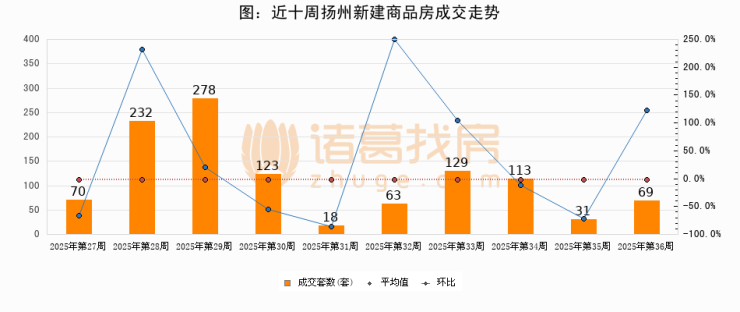 进入2025年第36周(09月01日-09月07日),扬州新建商品房成交69套,较上周增加38套,环比上涨122.6%。从近十周成交来看,周均成交套数为112套,本周成交69套,低于近十周平均成交量38.4%。