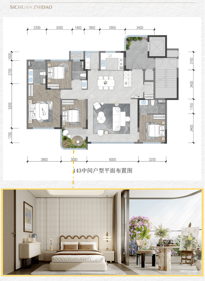 143㎡方厅/颂璟:中西两个厨房,全部明厨明卫,双主卧,客厅开间达约6米。景观阳台连接客厅和一个次卧,功能空间多变。