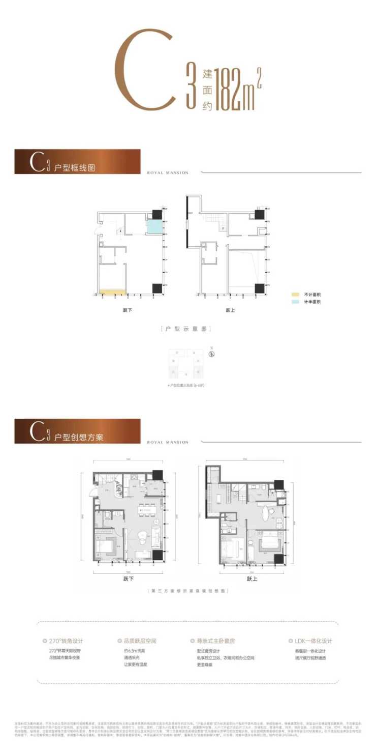 住宅户型方面,共分为四个主要户型,建面分别约为149㎡、162㎡、175㎡和182㎡。建面约149㎡和175㎡的户型为横厅,其余二者则为竖厅。四个户型均为跃上、跃下结构,横厅最大长度12.7m,可实现最大约16.5m的连续采光面;竖厅最大长度约11.4m,跃上面积略大于跃下。