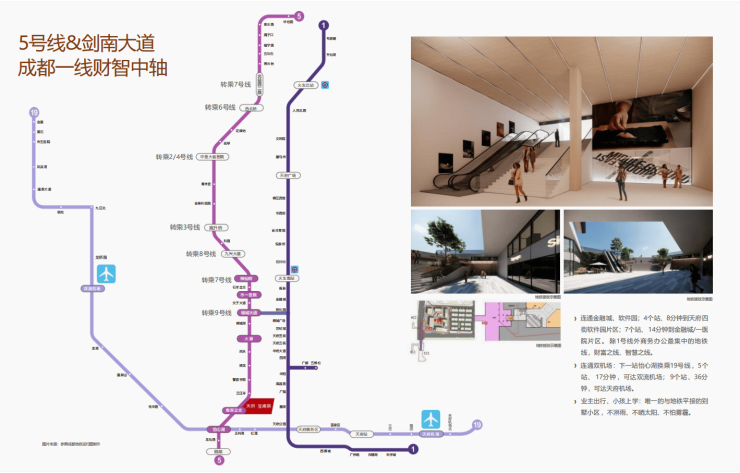 交通:由剑南大道、益州大道、华府大道、天府大道等纵向路网与牧华路、沈阳路、华阳大道、绕城等横向路网,轻松通达全城。地铁物业:与5号线南湖立交站无缝连接,一个站可换成19号线(双机场的专线)。