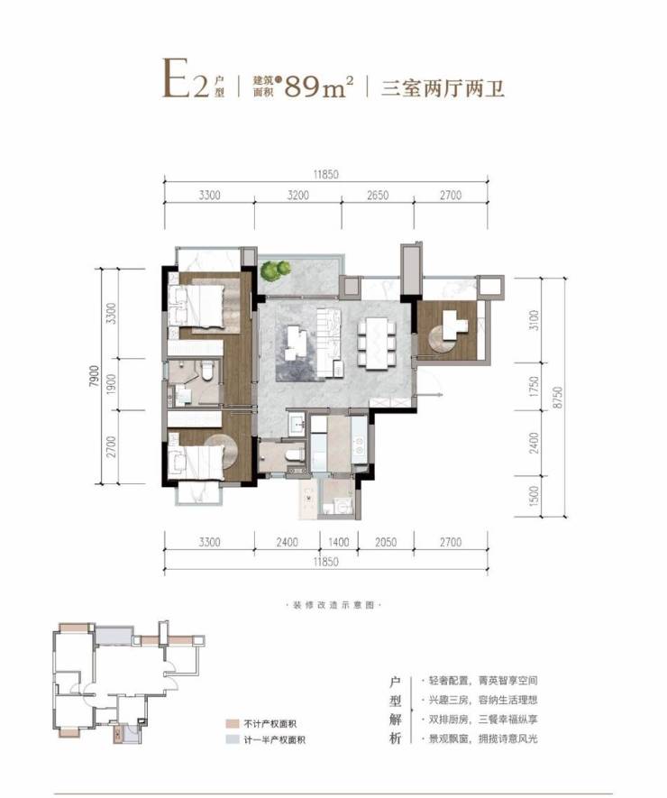 建面约89平套三