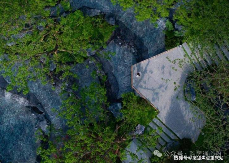 约4米高差,山涧跌瀑、小桥流水、蜿蜒山径、盘错而出的树影,岛屿与云彩交相辉映,树龄50年的稀贵大乌桕为青绿山水点缀上浓墨重彩的一笔,再现桃花源境的东方隐奢美学。
