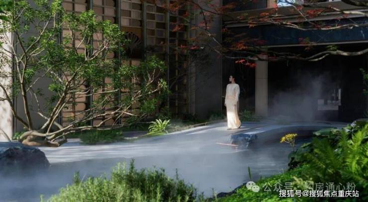 约48米超尺度“山檐归堂”宏伟门楼以“翠岛浮屿”的造型松、奢石和流水铺展“明月松间照,清泉石上流”的精致场景,地面融入编织纹青砖黛瓦,彰显尊贵与荣耀,又不失庄重与礼序。