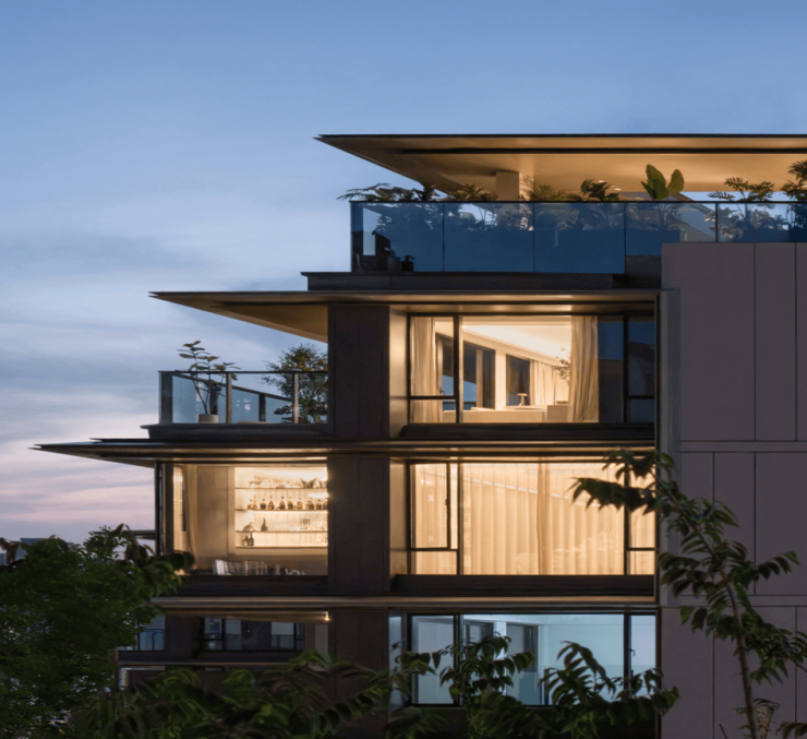 项目团队突破性地将独栋别墅的“五独立体系”——独立建筑单元、独立地下室、独享庭院、独立电梯入户及花园动线——注入叠墅形态,同时借鉴大平层“面宽极限化”设计,打造出下叠边户约26.7米U型采光面、中叠/上叠约15.4米超尺度面宽,使单层使用面积直逼200㎡级大平层。这种“叠墅独栋化”的创新,让天宸上院在寸土寸金的主城区实现了“近独栋”体验。