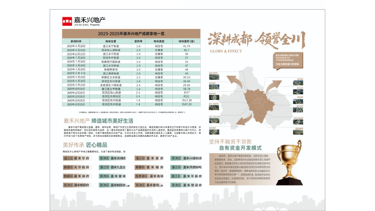 集团立足成都本土,辐射全川,布局主城区及二三圈层,已开发十余优质项目,携手绿城、龙湖等全国前五物业,服务超5万户业主。2025年业绩亮眼,上半年成都商品房销售额民企第二、销售面积民企第一;1-11月权益销售成交面积稳居成都民企地产榜首。(数据来源~四川克而瑞)