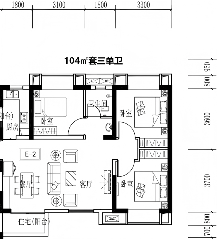 【面积】74㎡79㎡84㎡(套二单卫)、99㎡104㎡(套三单卫)、108㎡119㎡(套三双卫)