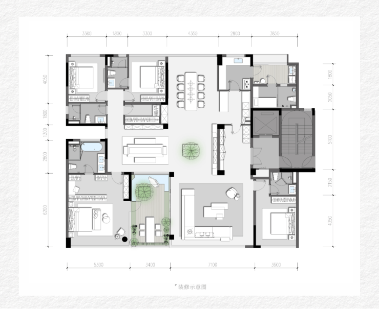 :一层两户,这个户型的餐厅和客厅都置于端户的最佳位置,有270度观景面,花园位于餐客厅之间,连起来最大采光面有16米多。玄关处有特别设计的储物空间,原本的走廊因为宽绰,可以设计为第二客厅或者亲子学习娱乐交流区。餐厅、客厅、第二客厅抬头都可见花园,如果有一园鲜花或是绿植,既可以沉浸其中也可以多角度观赏。