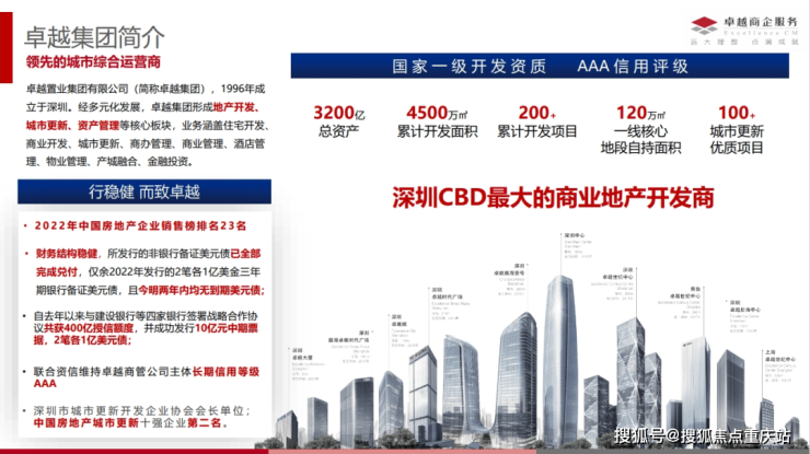中国领先的城市综合运营商:卓越集团发源深圳,是业内唯一一个同时布局深圳四大中心区(福田、宝安、前海、后海)的开发商,也是这四大中心区最大的商业地产开发商,自持写字楼年租金收入超40亿元。成立27载行迹40余城,超200个项目。位列中国房地产开发企业销售22强,城市更新top2。自持物业管理规模高达700亿元,资产管理规模超1000亿元,时刻保持三档绿线范围内。