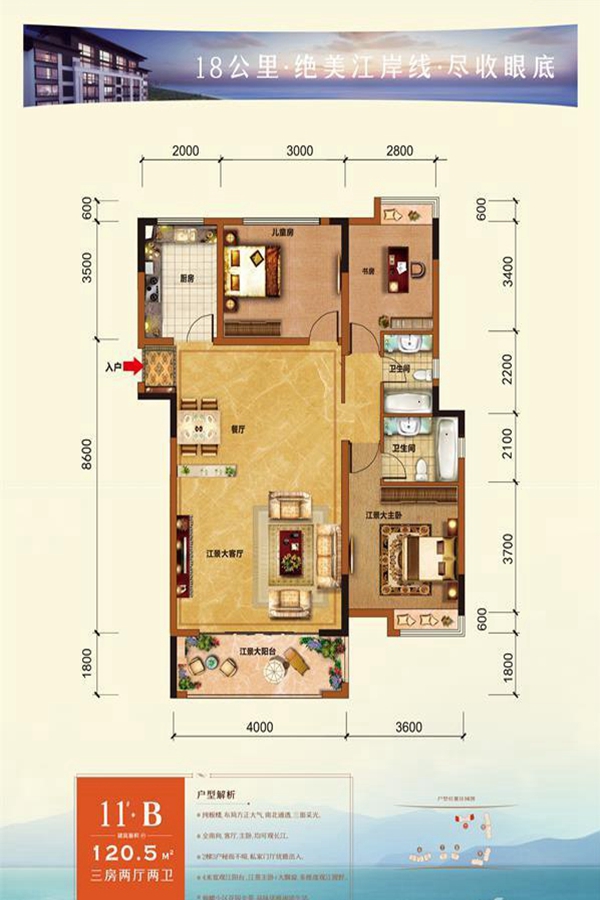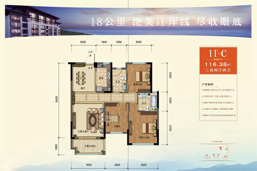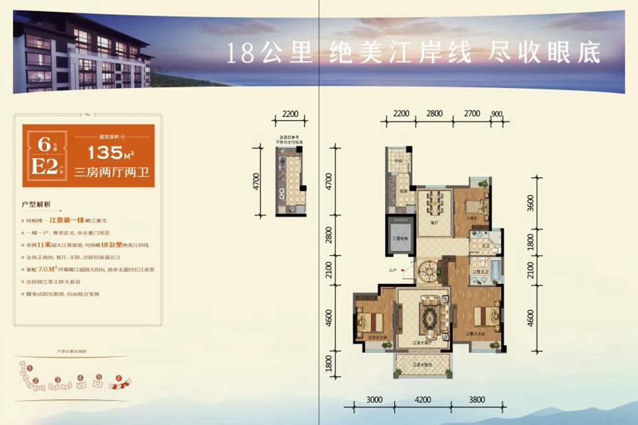 江畔大地,直面浩瀚长江,为270度、无遮挡、江景排名前列排瞰江豪宅。屹立于江畔大地,极目远舒,可纵瞰上游胜利三路长江大桥,与下游猇亭长江大桥之间,长达18公里的绝美江岸线,高远的寥廓视野,与地球天际线并行,奢阔的舒适尺度,尽显高瞻远瞩之风范;江畔大地,以270度无遮挡的宽景视野,呈现超广角、超宽屏景观,犹如IMAX环形银幕的震撼视觉,与江、山、风、阳光、星辰,共同构筑宜昌高端的全景式国际住区。