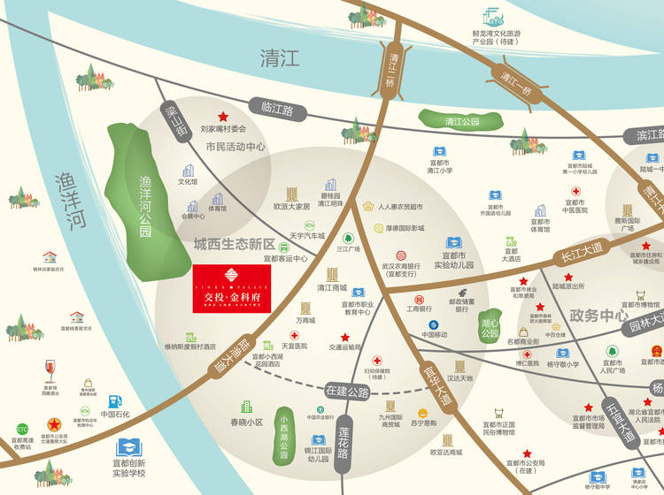 宜都交投·金科府系国匠交投与千亿金科两强联袂著作。项目位于宜都城西,城市发展主轴线陆渔大道与小西湖路延伸段交汇处。地处政府重点打造的生态宜居新城,未来城市重点发展方向,行政、医疗、教育、交通等配套齐全。西侧北师大创新实验学校为宜都较好的私立学校,北侧渔洋河将打造为城市内河景观带,提升居住品质。规划五场一馆、市民活动中心等城市休闲配套已进入封顶验收阶段,地块东侧新客运站已启用。项目总体规划为区域内集住宅、别墅、生活配套等多功能为一体的约23万方的宜都品质生活标杆。