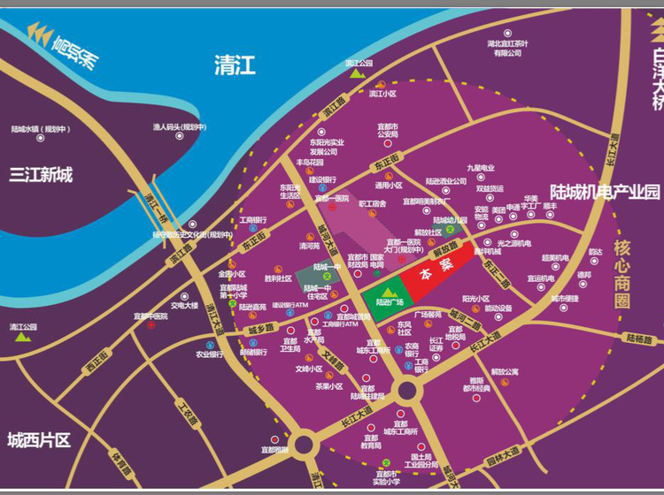 宜都市城河大道和解放大道交汇处,项目西面是陆逊广场,北面是宜都市一医院和陆城幼儿园,东面是解放社区,南面是阳光小区,交通便利、位置优越。