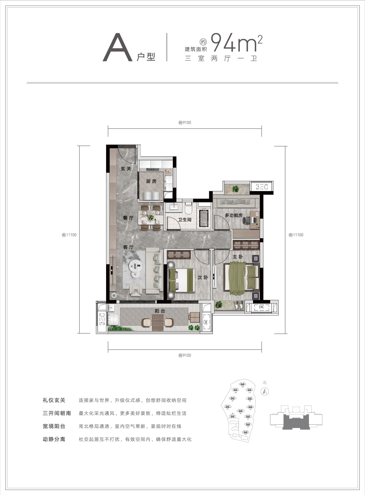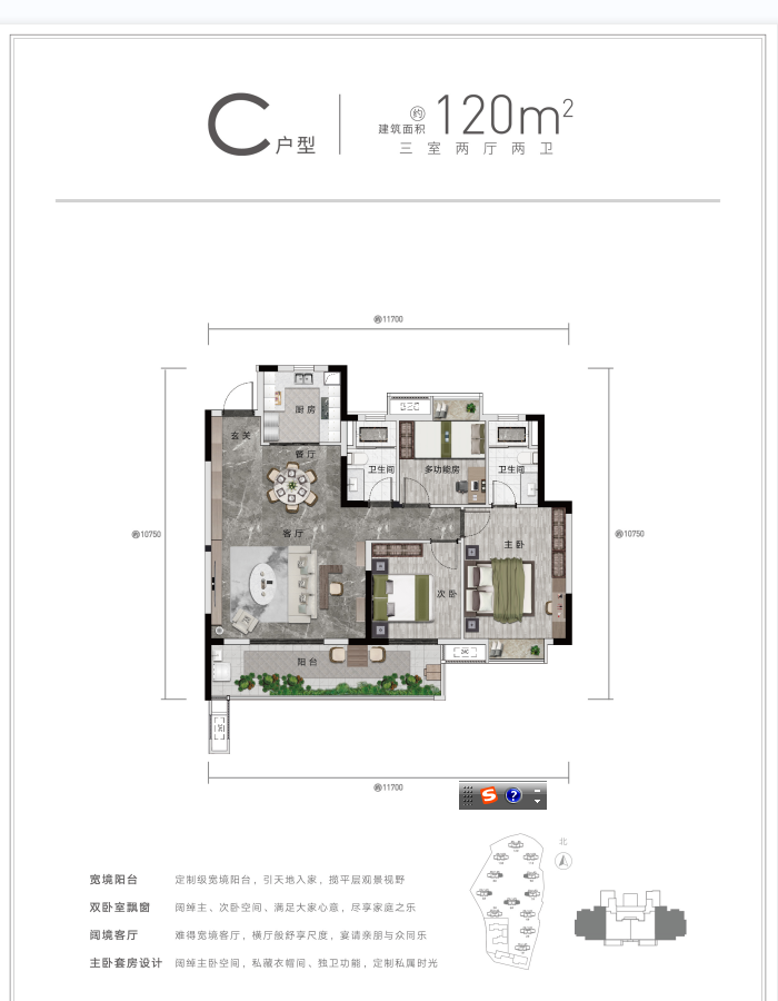 项目总计容建筑面积约12万方,由12栋住宅,1栋商业,1栋幼儿园及其他若干公建配套、娱乐设施和景观设计组成。项目整体绿地率为35%,容积率为2.6,项目共计住宅1204户,地上地下车位合计1502个,车位配比为1:1.2。项目产品面积段为93-122㎡,满足了从单身到多口之家的不同生活需求。总体规划设计理念:力求打造一个“城市核心”——高品质全能的理想新城。项目建筑风格:现代简约风格,通过优雅的清新的建筑材料,营造温馨宁静幽雅的生活氛围。 园林风格:由“两轴三心五空间”组成,建筑配以丰富的景观元素,营造疏密有致、高低不同、环环相扣的景观体系,打造曲径通幽、步移景异的私家园林。装修亮点:马可波罗地砖、方太厨房三件套、摩恩卫浴、海帝诗橱柜五金件等,同时增配净水系统、九牧智能马桶以及可视对讲等,以人为本,关注生活的需求和细节,提高居住舒适性,打造高品质社区。