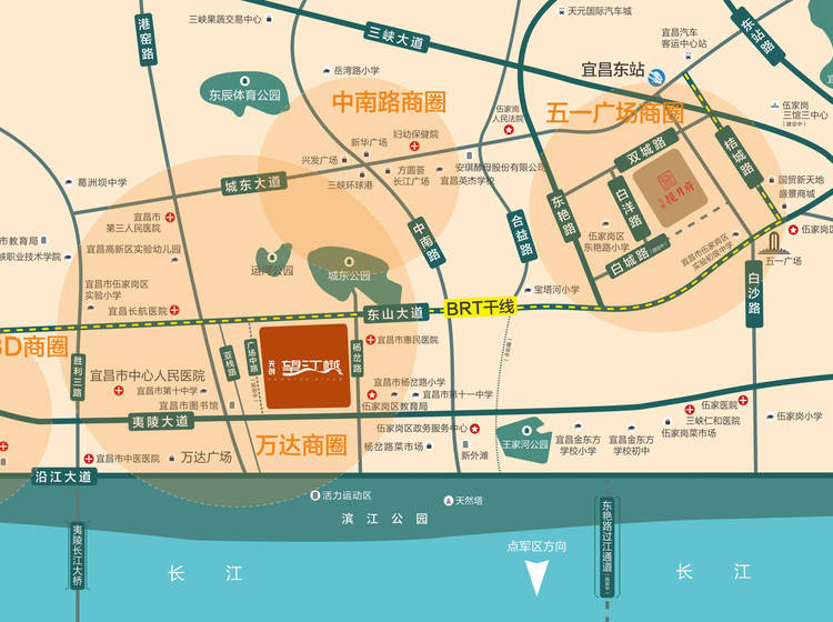 与夷陵大道、沿江大道、东山大道等城市主干道连通,快速接驳城市交通枢纽站点,架构城芯立体路网,家门口的BRT公交系统,数十条公交线路,便捷出行更多选择。