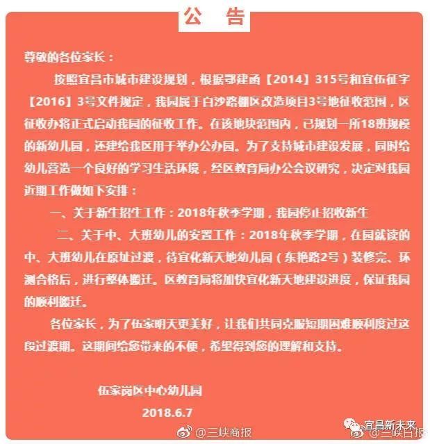 伍家岗区中心幼儿园发布公告,因城市建设规划幼儿园将整体搬迁,2018年秋季学期停止招收新生。在园就读的中、大班幼儿在原址过渡,待宜化新天地幼儿园(东艳路2号)装修完、环测合格后,将进行整体搬迁。
