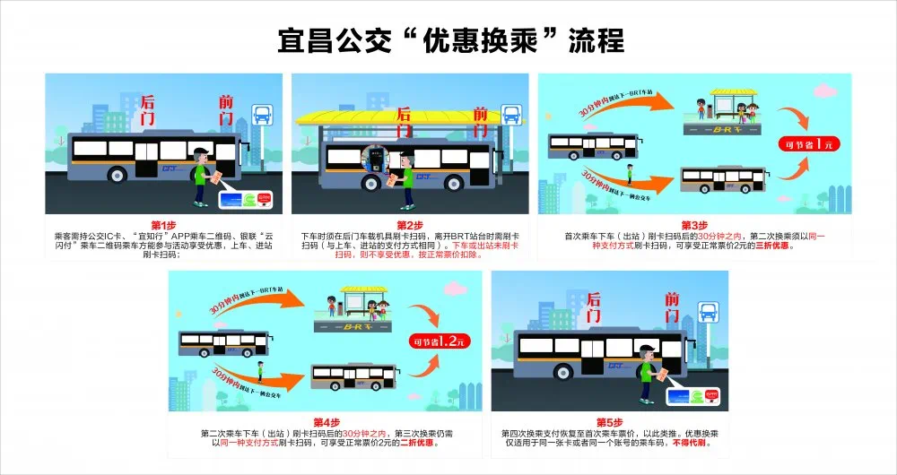注意:换乘下一趟公交车,自后门刷卡、扫码起记时,间隔时间请控制在30分钟以内,超出时限则不能享受优惠。第二次乘车可享受正常票价的三折优惠,仅需支付0.6元,银联“云闪付”采取延时扣费,IC卡和“宜知行”乘车二维码可通过刷卡机显示收费情况。