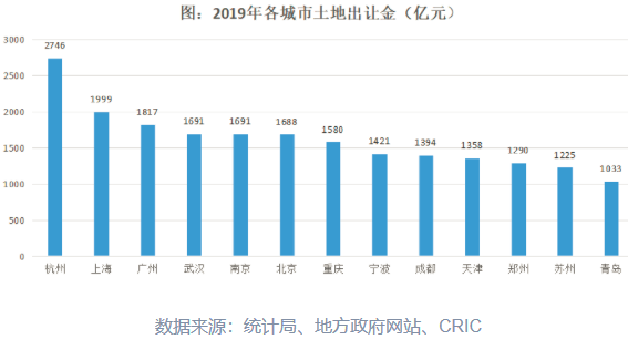 这主要是由于2019年,杭州以2746亿元蝉联土地出让金榜首,较2018年增幅高达13%,较第二位的上海高出700余亿元,约是北京土地出让金的1.6倍,深圳的3.9倍。
