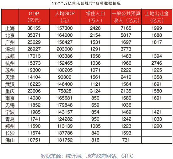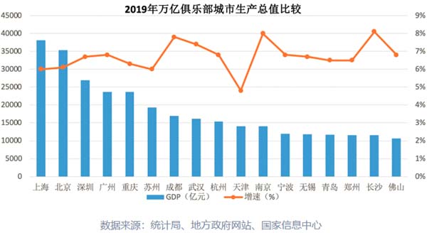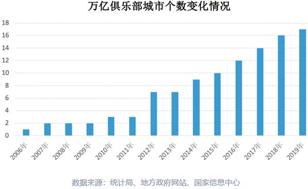 截止2019年年末,我国共有17座城市入围“万亿俱乐部”行列,比2018年增加1个,比2010年增加7个。这17个城市分别是:北京、天津、上海、重庆、南京、苏州、无锡、杭州、宁波、青岛、郑州、武汉、长沙、广州、深圳、佛山、成都。