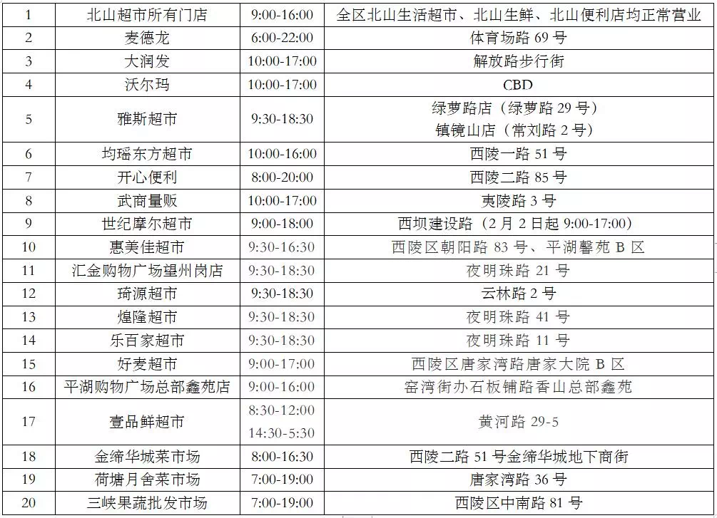 全力进行疫情防控,我区有关部门和多家企业,采取多渠道、多措施保障蔬果等市场物资供应,确保居民生活安定有序。现整理西陵区正常营业超市、菜市场和营业时间一览表方便广大市民。