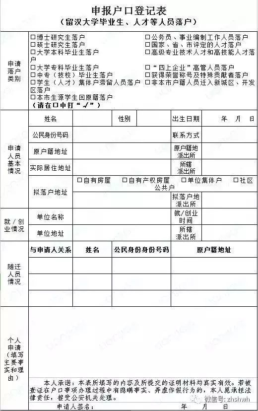 1.本人填写《申报户口登记表》(可在武汉公安“网上警局”下载或到分局户籍窗口领取,手写签名)(留存原件);