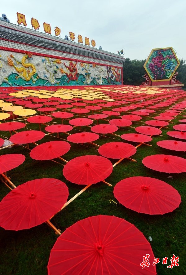 园博园举行了“中国红-大地艺术游园会”,以油纸伞、灯笼、绸缎、帷幔等中式传统元素为载体,将园内布置得十分喜庆,尤其是东门内草坪上,560把红、黄伞组成“我爱武汉”的字母图案,成了游客必备打卡点。
