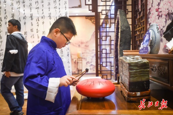 奇石馆夜游会上,一个孩子试着敲击空灵鼓。 记者许魏巍 摄