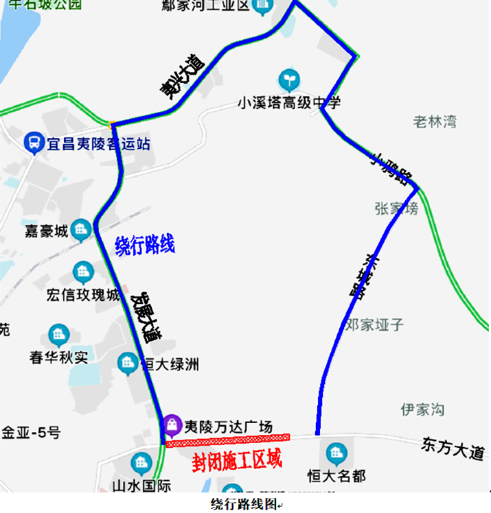 三、原途经施工路段可经发展大道、夷兴大道、小鸦公路、东城大道往返通行。