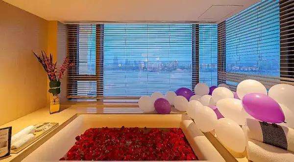 黄色的灯光,大大的落地窗,摆上一束鲜花,气球摆在浴室的各个角落,玫瑰花瓣洒满浴缸,营造温馨浪漫的气氛,也是最让人心动的时刻。